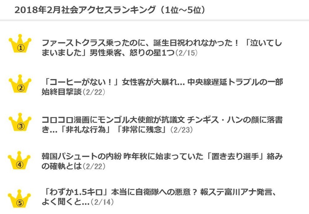 J Castニュースランキング 2月は ファーストクラス 中央線 の乗客トラブルに仰天 J Cast ニュース